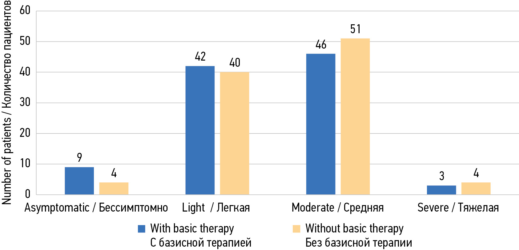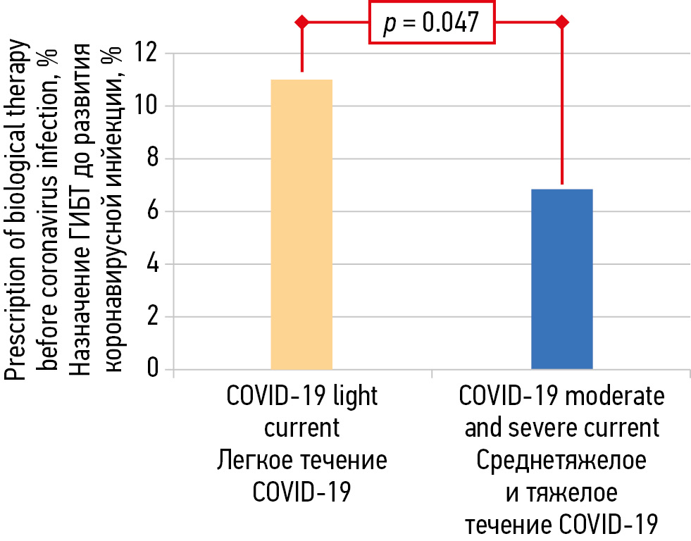 Fig. 2. COVID-19 severity in patients with immunoinflammatory rheumatic diseases depending on the use of baseline therapy before COVID-19 / Рис. 2. Степень тяжести COVID-19 у пациентов с иммуновоспалительными ревматическими заболеваниями в зависимости от применения базисной терапии до COVID-19