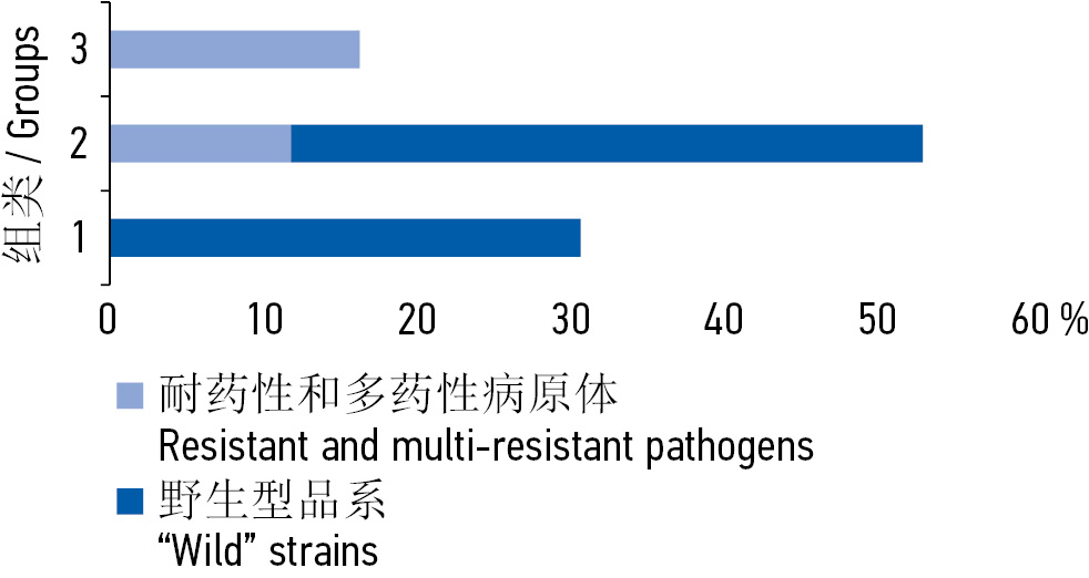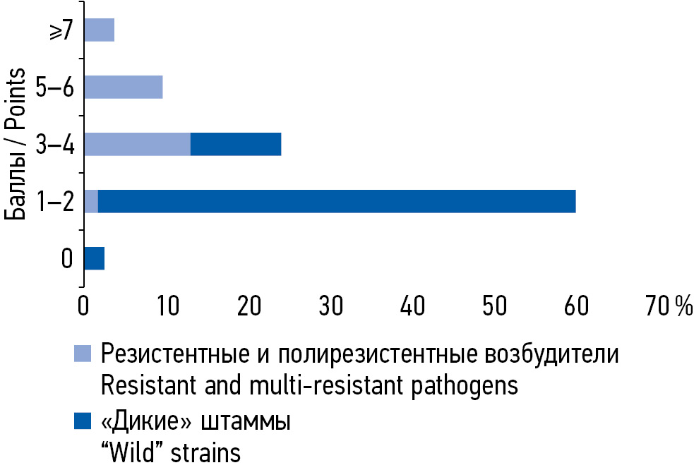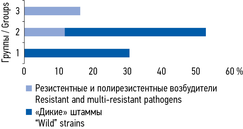 Fig. 3. The ratio of antibiotic-resistant phenotypes causative agents of endometritis and CIRS-Obs indices: 0–1 points — 1st group (no risk of developing an infection resistant to antibiotics); 2-3 points — group 2 (standard risk) and ≥4 points — group 3 (high risk) / Рис. 3. Соотношение фенотипов антибиотикорезистентных возбудителей эндометрита и индексов CIRS-Obs: 0–1 балл — 1-я группа (отсутствие риска развития инфекции, резистентной к антибиотикам); 2–3 балла — 2-я группа (стандартный риск) и ≥4 баллам — 3-я группа (высокий риск)