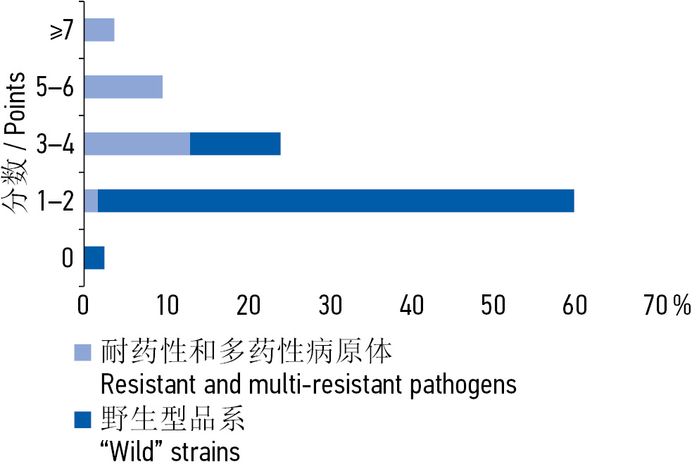 Fig. 2. Distribution of the patients by the levels of the cumulative illness rating scale (CIRS) according to the proportion of resistant and multidrug-resistant pathogens isolated from lochia / Рис. 2. Распределение пациенток по уровням кумулятивной шкалы рейтинга заболеваний (CIRS) в соответствии с долей изолированных из лохий резистентных и полирезистентных возбудителей