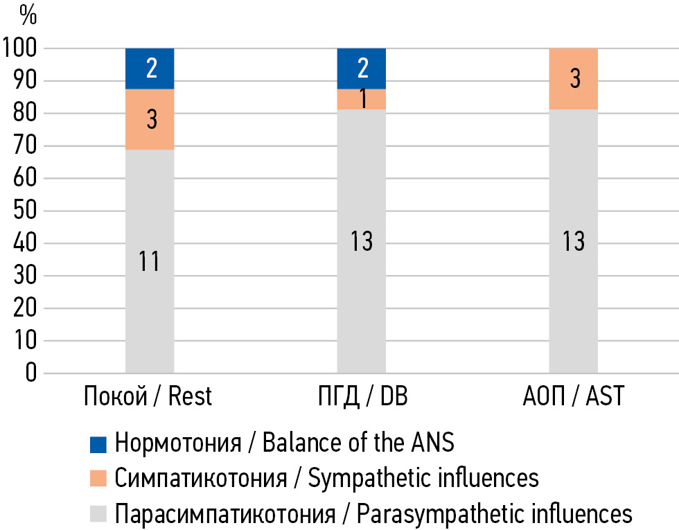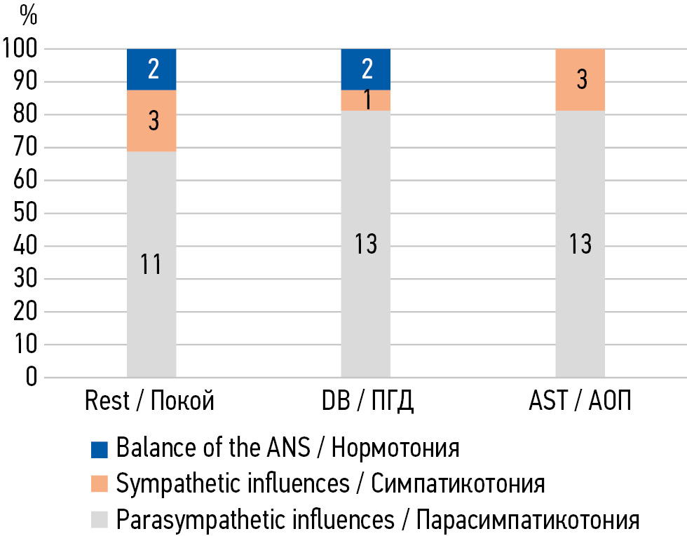 To clarify the nature of the reaction to stimulation of the parasympathetic division of the ANS, we conducted a test with deep breathing. When comparing heart rate variability in this sample with background values, we noted a significant increase in CV as the percentage ratio of SDNN to R-RNN increased (Table 2). An individual program analysis of heart rate variability showed that during the deep breathing test, the number of individuals with parasympathetic influence of the ANS on the rhythm increased to 13 (Figure). In most patients, the change in heart rate variability in the deep breathing test was induced by the preservation or increase in the vagal effect on the heart rate, which was an adequate response of the ANS to the autonomic test.