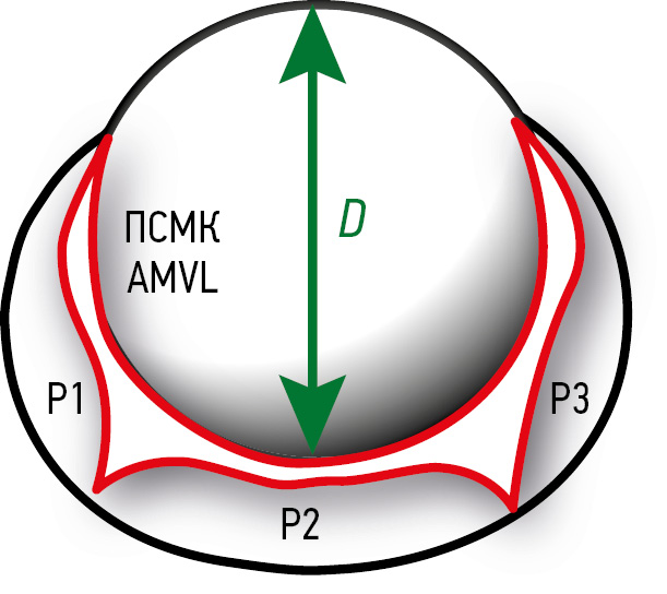 Рис. 2. Митральный клапан. Вид со стороны оператора. Дилатация фиброзного кольца, створки не смыкаются, удлинение сегмента Р2 задней створки. Схема участка передней створки митрального клапана: D — целевой диаметр фиброзного кольца после имплантации полоски из аутоперикарда; ПСМК — передняя створка митрального клапана; Р1, Р2, Р3 — сегменты задней створки митрального клапана