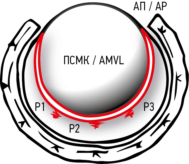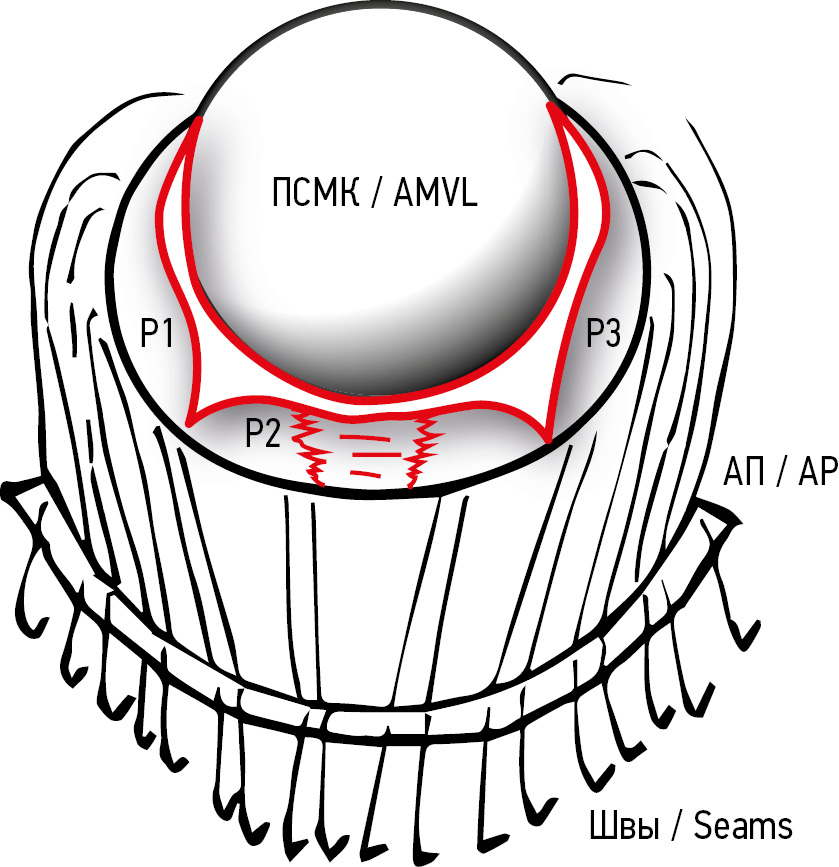 Рис. 3. Прошитое фиброзное кольцо митрального клапана и прошитая полоска из аутоперикарда. Ширина полоски 5 мм, длина полоски рассчитана по формуле. На фиброзное кольцо митрального клапана наложены одиночные горизонтальные швы из плетеной синтетической нити 2/0, которые затем прошиты через полоску из аутоперикарда. В качестве примера одновременного вмешательства на створках приведена вальвулопластика в виде резекции удлиненного сегмента Р2 задней створки митрального клапана. ПСМК — передняя створка митрального клапана; Р1, Р2, Р3 — сегменты задней створки митрального клапана; АП — полоска из аутоперикарда