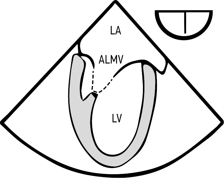 Fig. 1. Schematic illustration of a two-chamber plane of the heart when performing transesophageal echocardiography, necessary to determine the length of the median part of the anterior mitral valve leaflet: the measurement is carried out from the fibrous annulus to the free edge of the leaflet in the A2 segment. LV — left ventricle, LA — left atrium, ALMV — the anterior leaflet of the mitral valve