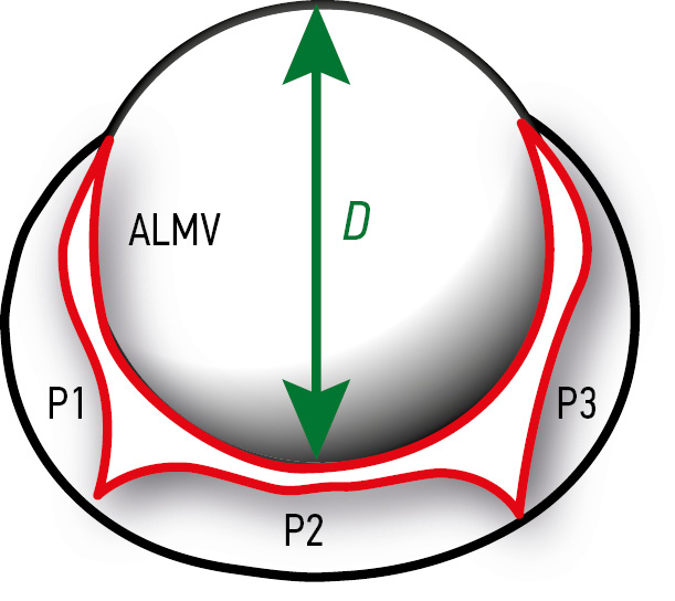 Fig. 2. Mitral valve. Viewed from the operator’s side. There is a dilation of the fibrous annulus; the cusps do not close; lengthening of the P2 segment of the posterior cusp. Diagram of the anterior mitral valve leaflet: D — target fibrous annulus diameter after implantation of an autopericardial strip; ALMV — the anterior leaflet of the mitral valve; P1, P2, P3 — segments of the posterior leaflet of the mitral valve