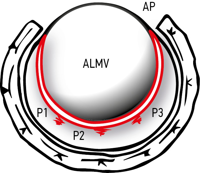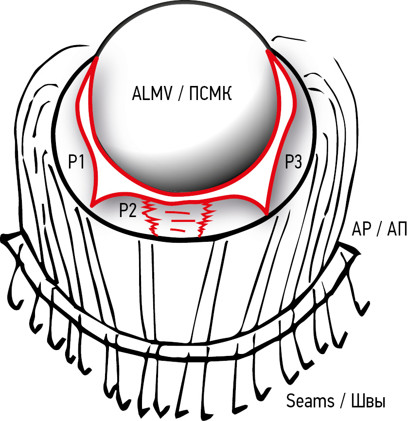 Fig. 4. An autopericardial strip is implanted; the interrupted sutures are tied. The final view of the mitral valve after correction of the concomitant pathology of the posterior leaflet (in this case, resection of the segment P2 of the posterior leaflet) and narrowing of the dilated fibrous annulus by implantation of a strip from the autopericardium of the estimated length. ALMV — the anterior leaflet of the mitral valve; P1, P2, P3 — segments of the posterior leaflet of the mitral valve; AP — a strip from the autopericardium