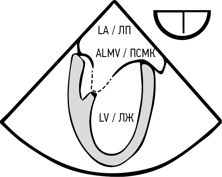 Рис. 1. Схема двухкамерной проекции сердца при выполнении чреспищеводной эхокардиографии, необходимой для определения длины срединной части передней створки митрального клапана: измерение от фиброзного кольца до свободного края створки в сегменте А2. ЛЖ — полость левого желудочка, ЛП — полость левого предсердия, ПСМК — передняя створка митрального клапана