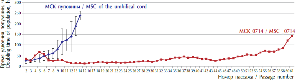 В культуре большинство образцов МСК пролиферируют в течение 1–2 мес. и далее вступают в процесс клеточного старения. Клетки МСК_0714 интенсивно пролиферировали и сохраняли иммунофенотип на протяжении 21–25 пассажей (3 мес. роста в культуре). В продолжение 4 мес. последующего роста в культуре выраженность признаков клеточного старения (активность SA-β-gal, ассоциированной со старением и укорочением теломер) нарастала. По нашим данным, на основе анализа научных публикаций (база данных PubMed) в ходе реализации проекта впервые была получена культура МСК, клетки которой обладали способностью к длительному культивированию in vitrо — в течение 59 пассажей или более 6 мес. В ранее опубликованных работах старение культур МСК человека с прекращением пролиферации клеток фиксировали не позднее 30-го пассажа [7–10]. Следует отметить, что значительный размер выборки, использованной в нашем исследовании, свидетельствует о том, что сохранение пролиферативного потенциала in vitro в течение длительного периода (более 20 пассажей), видимо, не является характерной особенностью МСК.