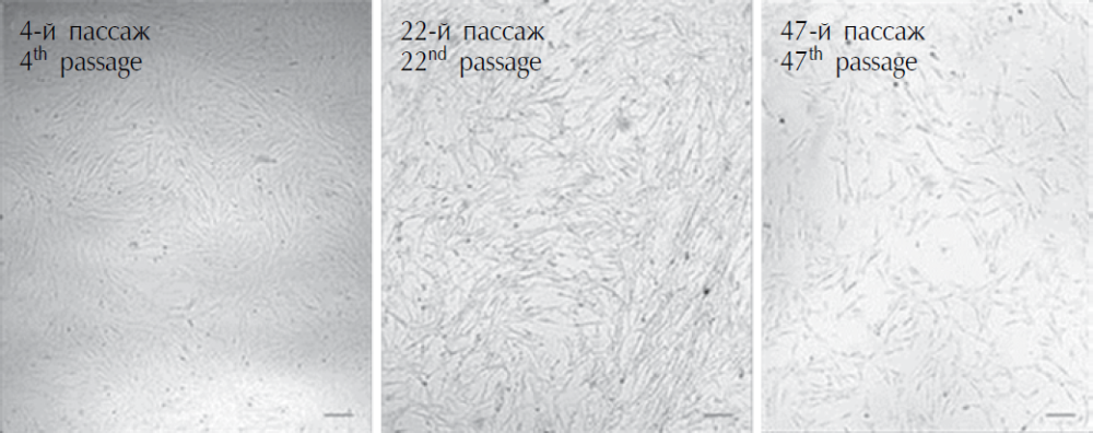 Рис. 2. Репрезентативные микрофотографии клеток культуры МСК_0714 на ранних (4-й пассаж), средних (22-й пассаж) и поздних (47-й пассаж) сроках культивирования. Световая микроскопия. Ув. ×400. Масштаб (50 мкм) указан на микрофотографиях