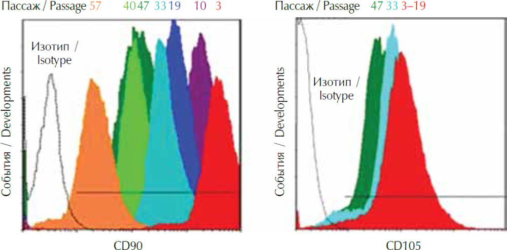Изменение экспрессии поверхностных антигенов при длительном культивировании. Иммунофенотипирование МСК_0714 при длительном культивировании выполняли на 2-м и 3-м пассажах, а затем — каждые 3–4 пассажа. На всем протяжении культивирования процентное содержание клеток, экспрессирующих антигены CD90, CD105, CD44, CD73 и отрицательных по экспрессии CD45, CD34, CD117, CD14, практически не изменялось и превышало 90 % (табл. 1). Несмотря на постоянное содержание в популяции клеток с МСК-специфичным иммунофенотипом, анализ интенсивности флуоресценции клеток, экспрессирующих CD90 и СD105, выявил, что с увеличением срока культивирования in vitro происходило заметное снижение плотности изучаемых антигенов на поверхности МСК (рис. 4).