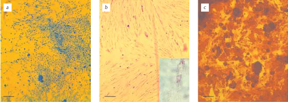 Рис. 5. Вид культур МСК_0714 28-го пассажа после 2-й недели культивирования в среде, содержащей хондрогенные (a — окрашивание альциановым синим), адипогенные (b — окрашивание жировым красным О) и остеогенные стимулы (c — окрашивание ализариновым красным). Световая микроскопия. Ув. ×400. Масштаб указан на микрофотографиях