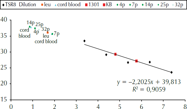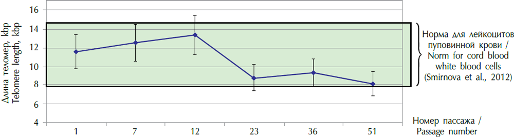 Сокращение длины теломер при неактивной теломеразе в МСК_0714 в ходе длительного культивирования. Для культуры МСК_0714 была проведена оценка изменения длины теломер в ходе культивирования. До 23-го пассажа МСК характеризовались стабильной длиной теломер, которая затем сокращалась в среднем на 30 %, однако оставалась в пределах, описанных для некультивированных клеток пуповинной крови (рис. 6).