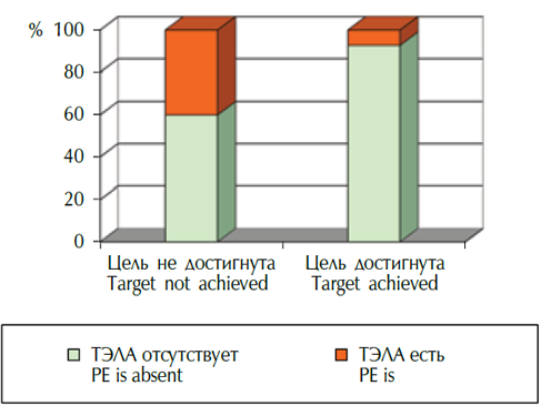 Рис. 2. Связь развития тромбоэмболии легочной артерии (ТЭЛА) с достижением целевой гликемии в первые 72 ч