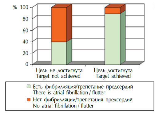 Рис. 3. Связь развития фибрилляции/трепетания предсердий с достижением целевой гликемии в первые 72 ч