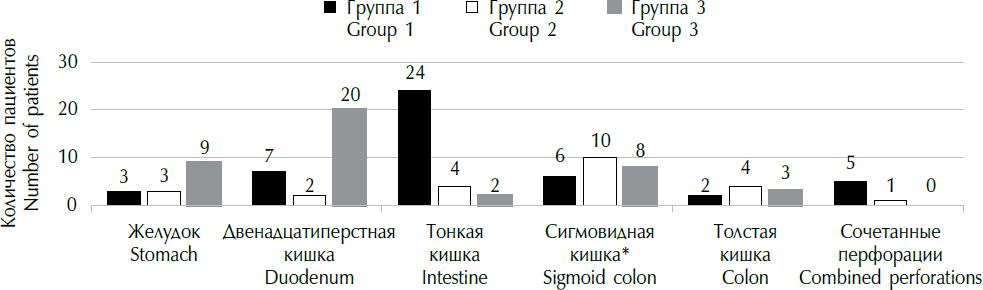 Рис. 2. Уровень перфорации желудочно-кишечного тракта у пациентов исследуемых групп. * Различия статистически достоверны (p < 0,05)