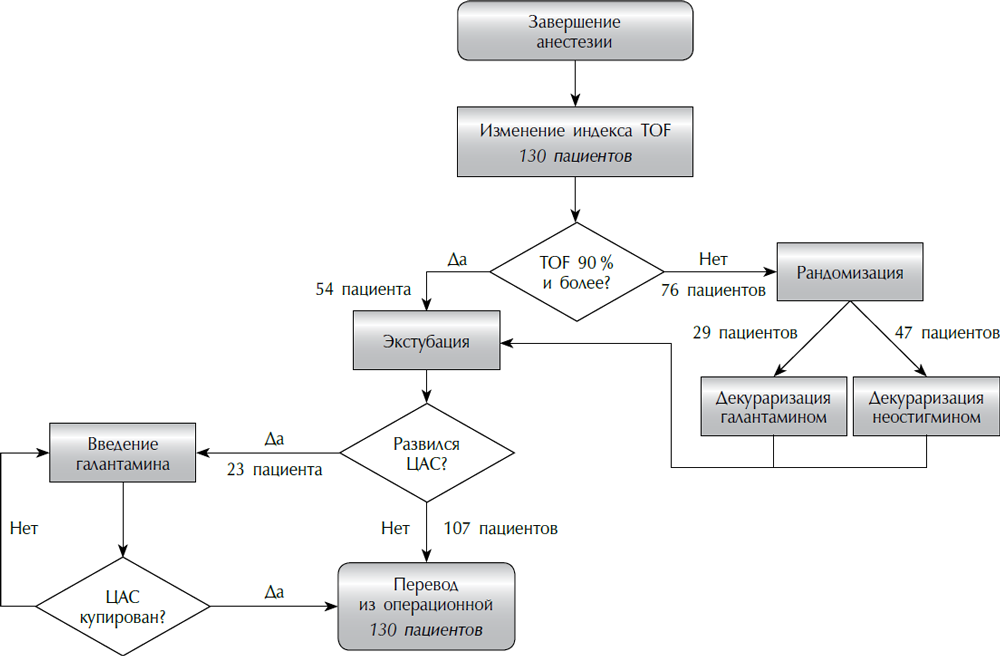 По завершении анестезии у всех пациентов оценивали нейромышечный блок, а затем распределяли их по вышеупомянутым группам, между II и III групами проводили рандомизацию методом конвертов. Если не было показаний к декураризации (индекс TOF ≥ 90 %), после восстановления сознания пациентов экстубировали; в случае развития у них ЦАС им вводили галантамин в дозе 0,3–0,4 мг · кг–1. Эта группа (I) служила для оценки встречаемости синдрома и эффективности его лечения галантамином. При наличии показаний (2 < TOF < 90 %) декураризацию проводили либо галантамином в дозе 0,3–0,4 мг · кг–1 внутривенно (группа II), либо неостигмином в дозе 0,04–0,05 мг · кг–1 внутривенно (группа III). Если у пациента, получившего неостигмин, развивался ЦАС, ему вводили галантамин в той же дозе, что и пациентам группы I. Схема разделения потока пациентов представлена на рис. 1. Препараты вводили при TOF ≥ 2, причем перед введением галантамина старались достичь уровня TOF = 4.