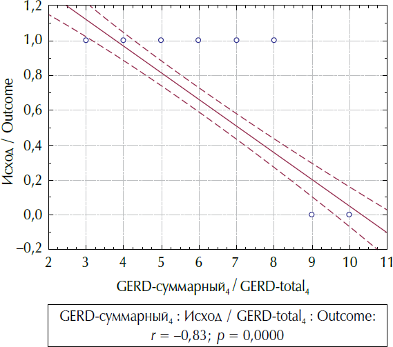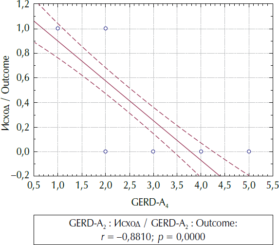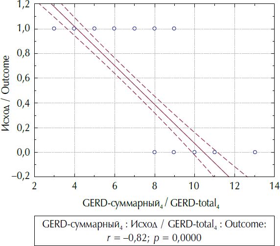 Сильные корреляционные связи отрицательной направленности были выявлены в паре показателей «Исход» и «GERD-А4»: r = –0,79; p = 0,001; 0,95 % CI = [–0,87; –0,67], «Исход» и «GERD-В4»: r = –0,78; p = 0,001; 0,95 % CI = [–0,86; –0,65], но наиболее сильная в паре «Исход» и «GERD-суммарный4»: r = –0,82; p = 0,001; 0,95 % CI = [–0,89; –0,71]. Результаты можно трактовать как увеличение вероятности эффективной терапии при уменьшении количества баллов в блоках А, В, а также суммы баллов через 4 недели терапии (рис. 2).