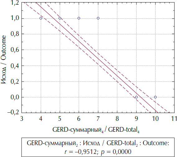 5. Fig. 4. Interrelation of indicators “Outcome” and “GERD-total4” in the group with hypersensitivity of the esophagus