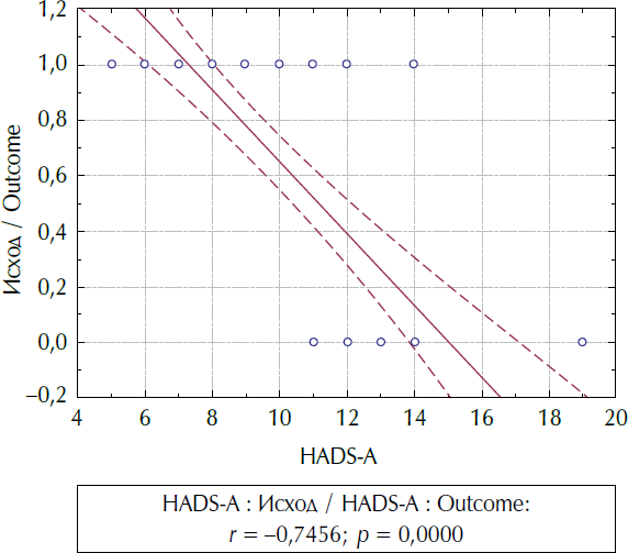 В группе с РЭ нами были выявлены отрицательные корреляционные связи исхода терапии с показателями шкалы HADS (табл. 5). Но только в паре показателей «Исход» и «HADS-А» была найдена сильная отрицательная корреляционная связь: коэффициент корреляции r = –0,75; p = 0,001; 0,95 % CI = [–0,85; –0,6]. Таким образом, терапия оказалась более эффективна у пациентов с меньшим значением показателя «HADS-А» (рис. 5).