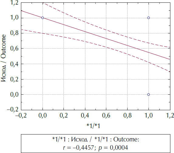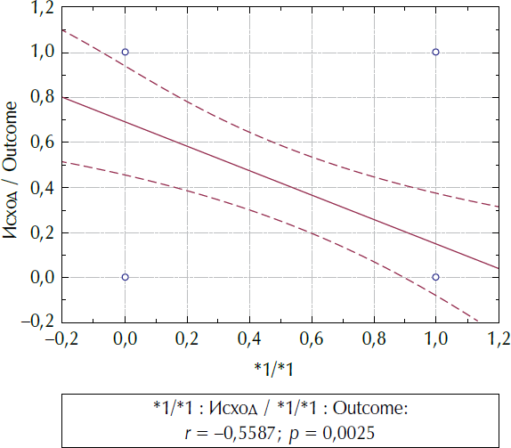 Ниже приводятся значения коэффициента корреляции r, уровень значимости p, 95 % доверительный интервал (CI) для коэффициента корреляции, графики рассеяния объектов в координатах соответствующих значений показателей. Показатель эффективности терапии, или «Исход», при построении графиков кодировался как «0» — для неэффективной терапии, «1» — для эффективной терапии, показатель «Скорость метаболизма» кодировался «1» — для быстрого, «0» — для промежуточного типа метаболизма.