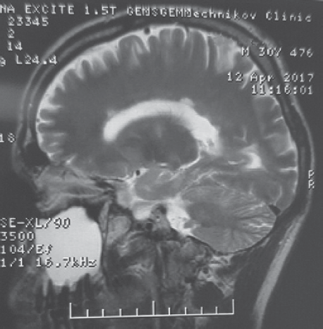 Рис. 1. МРТ Т2 ВИ больного З. Перивентрикулярная демиелинизация, вентрикулярная дилатация и конвекситальная атрофия мозга