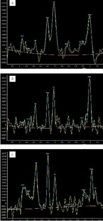 Выполнено дополнительное исследование (проф. А.В. Поздняков): протонная магнитно-резонансная спектроскопия (+Н-МРС) по одновоксельной методике (STEAM, TE = 31). Определены основные группы метаболитов: N-ацетиласпартат, холин, креатин, миоинозитол, глютамин/глютамат, липиды (рис. 3).