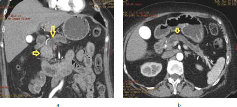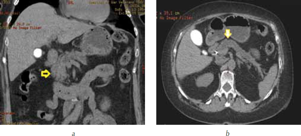 Рис. 1. Компьютерная томография гепатопанкреатодуоденальной зоны в нативную фазу сканирования: а — трехмерная реформация в алгоритме MIP. Головка поджелудочной железы однородной структуры (стрелка), опухоль не видна; b — трехмерная реформация в аксиальной проекции. В теле и хвосте поджелудочной железы расширен главный панкреатический проток (стрелка)