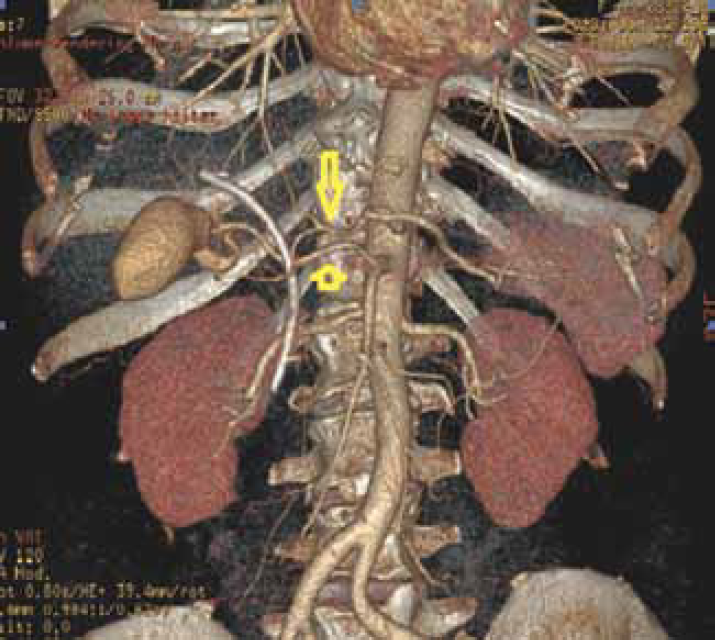 При сканировании в артериальную фазу и построении объемных реформаций была установлена важная при выполнении радикального оперативного вмешательства особенность строения артерий целиакомезентериального бассейна в виде отхождения правой печеночной артерии от верхней брыжеечной артерии (рис. 2).