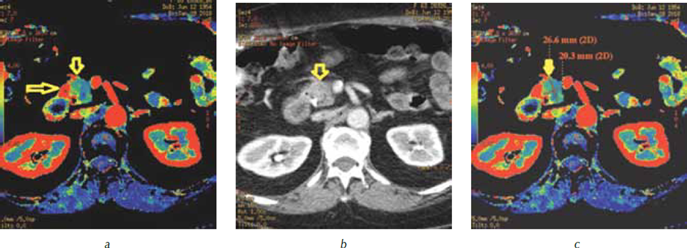 Рис. 4. КТ-перфузия поджелудочной железы: а — перфузионная карта скорости кровотока (BF). Опухоль в головке поджелудочной железы определяется в виде участка синего и зеленого цветов (короткая стрелка), четко видны границы опухоли с неизмененной паренхимой, имеющей красный цвет (длинная стрелка); b — трехмерная реформация в аксиальной проекции. Панкреатическая фаза. Головка поджелудочной железы (стрелка) равномерно накапливает контрастный препарат, опухоль не видна; c — перфузионная карта скорости кровотока (BF). Размеры опухоли составили 26,6 × 20,3 мм