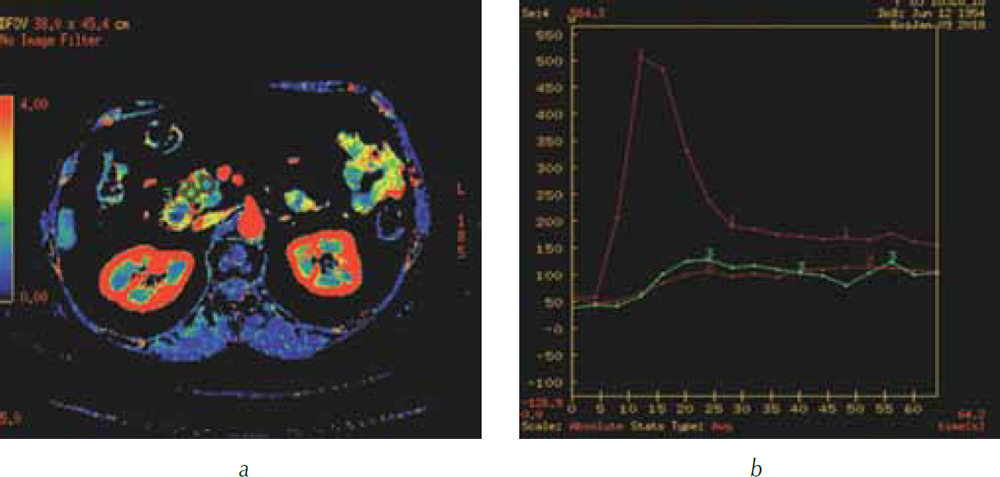 При данном исследовании в зоне интереса после внутривенного болюсного введения контрастного вещества выполняется несколько серий динамических сканирований в течение короткого интервала времени (41–85 с). Затем полученные данные подвергаются постпроцессорной обработке на рабочей станции компьютерного томографа с помощью специального программного обеспечения. Для расчета параметров перфузии, построения графиков и функциональных карт производится измерение и сравнение плотности в афферентной артерии и в зонах интереса. Стандартными показателями перфузии, которые рассчитываются при оценке состояния органов ГПДЗ, являются скорость кровотока (BF — blood-flow), объемный кровоток (BV — blood-volume), среднее время прохождения контрастного вещества (MTT — mean transit time). В норме поджелудочная железа характеризуется высокими показателями перфузии: BF — 111+/–15,70 мл/100 г/мин; BV — 19,64+/–2,48 мл/100 г [1, 5].