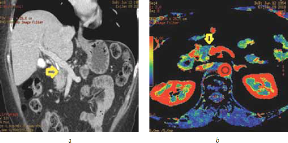 Рис. 6. Компьютерная томография гепатопанкреатодуоденальной зоны в портальную фазу сканирования: а — трехмерная реформация в алгоритме MIP. Перешеек поджелудочной железы (стрелка) прилежит к портомезентериальному стволу, границы опухоли не видны; b — перфузионная карта скорости кровотока (BF). Опухоль (стрелка) в головке поджелудочной железы вплотную прилежит к правой боковой стенке воротной вены (стрелка) без сохранения жировой прослойки. Контур вены в месте контакта с опухолью уплощен