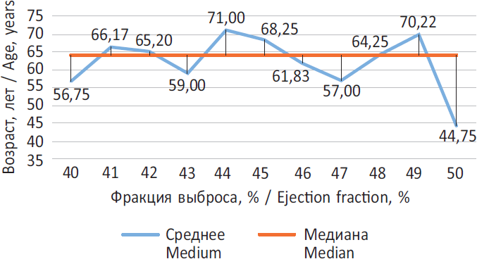 Рис. 1. Средний возраст пациентов в зависимости от фракции выброса левого желудочка