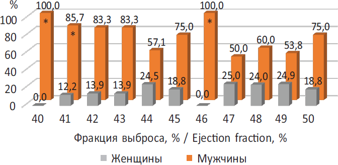 Рис. 2. Распределение пациентов по полу в зависимости от фракции выброса левого желудочка (* при p < 0,05 различия достоверны)