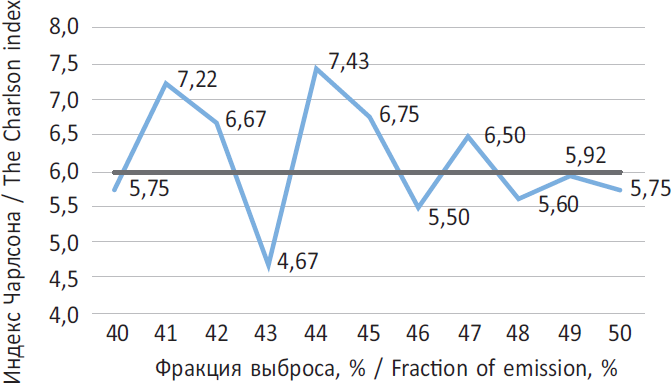 Из рис. 3 видно, что индекс коморбидности имеет широкую вариабельность, однако стоит обратить внимание на связь индекса Чарлсона и летального исхода больных. Так, по литературным данным, при индексе Чарлсона, находящемся в границах от 3 до 4, риск смерти составляет 52 %, а более 5 — 85 %.