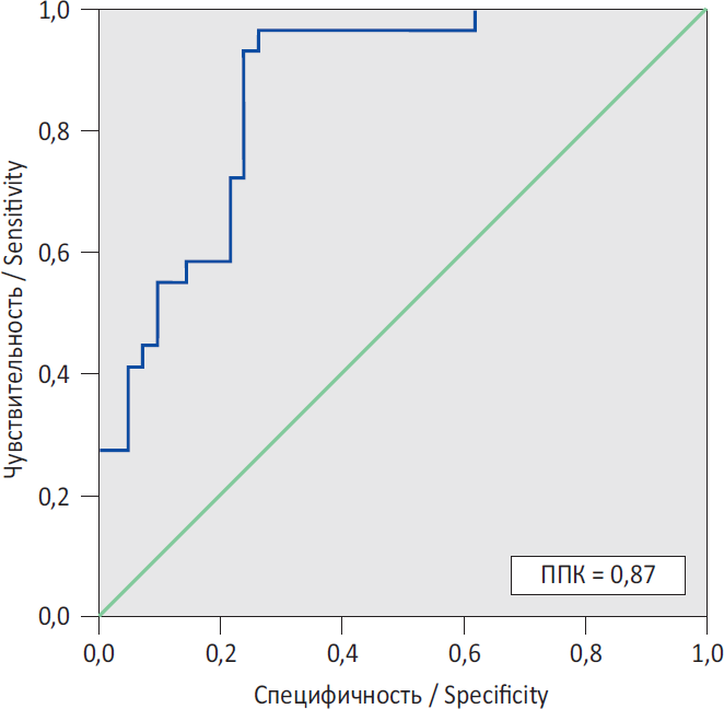 Полученная площадь под кривой равнялась 0,87, что соответствовало очень хорошему качеству модели. Расчетная чувствительность модели — 91,4 %, специфичность — 72,2 %.