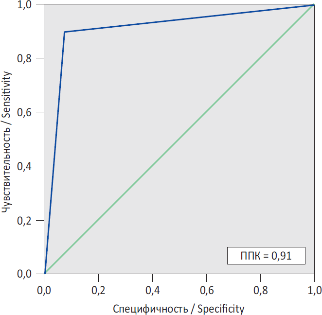 Площадь под кривой равнялась 0,91, что соответствовало значению «отлично» на экспертной шкале ППК. Расчетная чувствительность модели — 89,7 %, специфичность — 71,1 %.