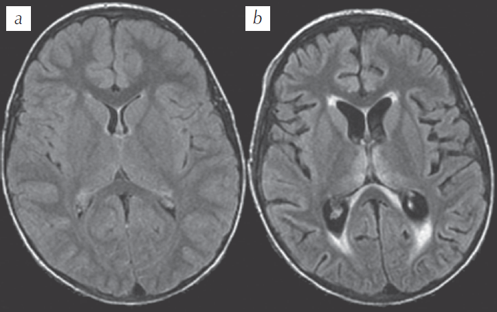 Fig. 1. Patient, 4 y. o. Diagnosis: FIRES: а — axial fluid attenuated inversion recovery image on day 1 of hospitalization shows no abnormalities; b — axial fluid attenuated inversion recovery image on day 30 of hospitalization — widening of sulci and lateral ventricles suggestive of diffuse cerebral atrophy, hyperintense signal changes are seen in bilateral thalami as well as along the ependymal margins of the ventricles and peri-atrial regions (J Perumpillichira. 2014)