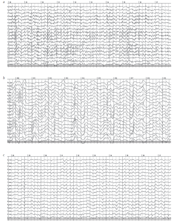 Рис. 2. Пациентка С.К., 15 лет. Диагноз: FIRES: a — ЭЭГ в 1-е сутки заболевания — диффузные изменения в виде дезорганизации фонового ритма избыточной бета-активностью; b — ЭЭГ на 5-е сутки заболевания — диффузное замедление фонового ритма, в правой лобно-височной области фиксируются комплексы «острая волна — медленная волна»; c — ЭЭГ перед выпиской (20-е сутки заболевания) — отчетливая положительная динамика, умеренное замедление фонового ритма, исчезновение эпилептиформной активности на фоне лечения. Собственное наблюдение