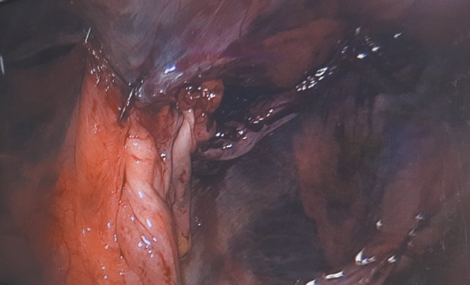 Фиксация эксплантата к передней брюшной стенке выполнена титановыми скрепками. Эксплантат перитонизирован (рис. 4).
