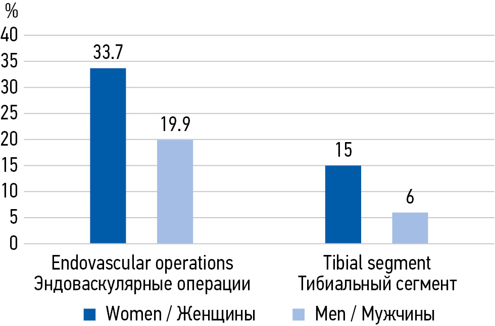 In the presence of a multilevel peripheral arterial disease, the predominant lesion of certain segments in men and women was not the same [9]. Changes in the tibial segment were more common in the main group, leaving the possibility for endovascular revascularization.
