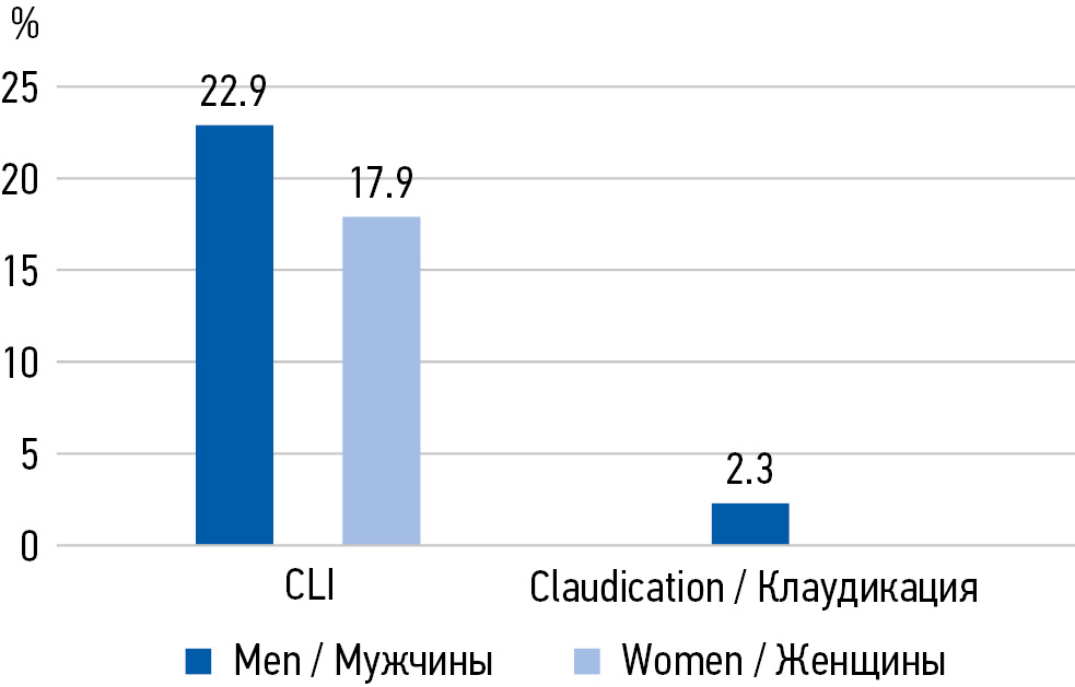 Hormonal gender characteristics affect the timing of the manifestation of peripheral atherosclerosis and CLI; in most cases, clinical manifestations occur much earlier in men [6], as confirmed in this study.