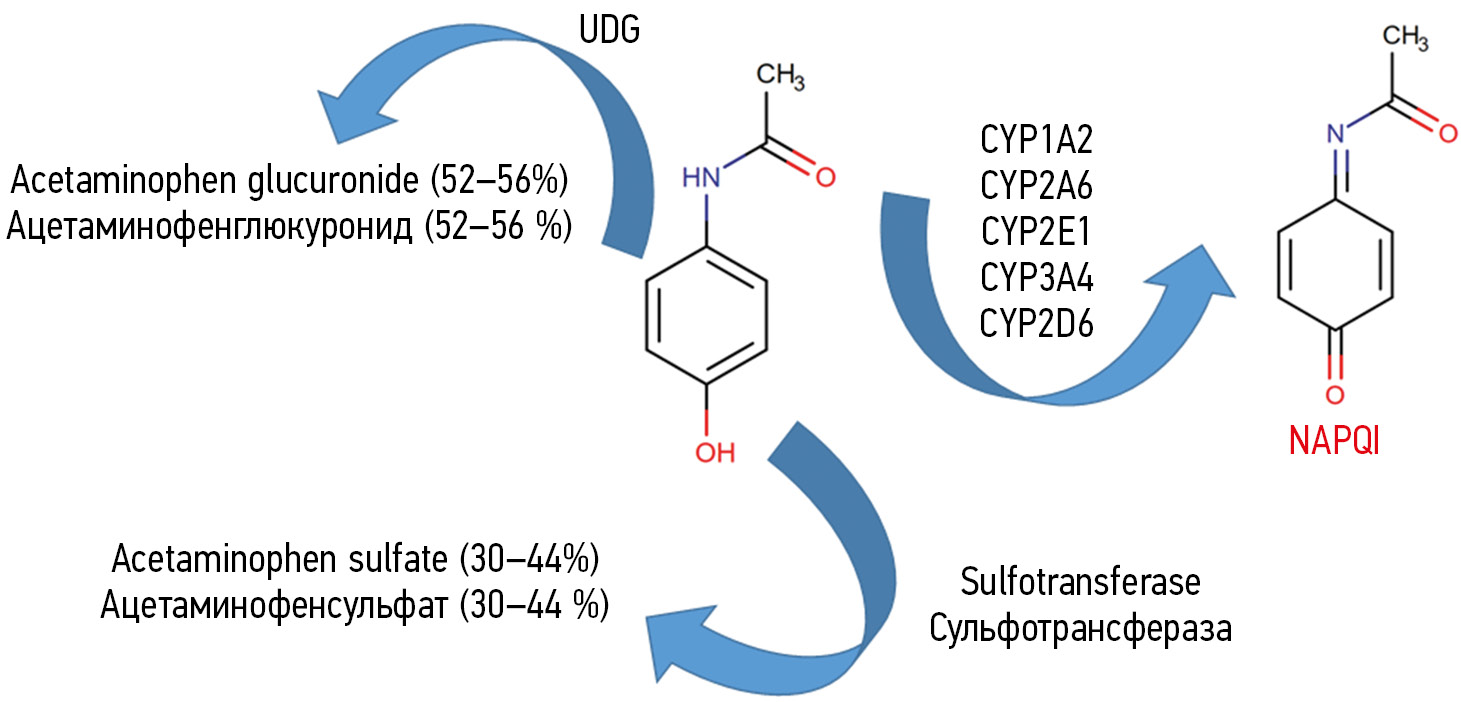 Рис. 1. Метаболизм парацетамола. NAPQI — N-ацетил-парабензохинонимин; UDG — УДФ-глюкуронилтрансфераза