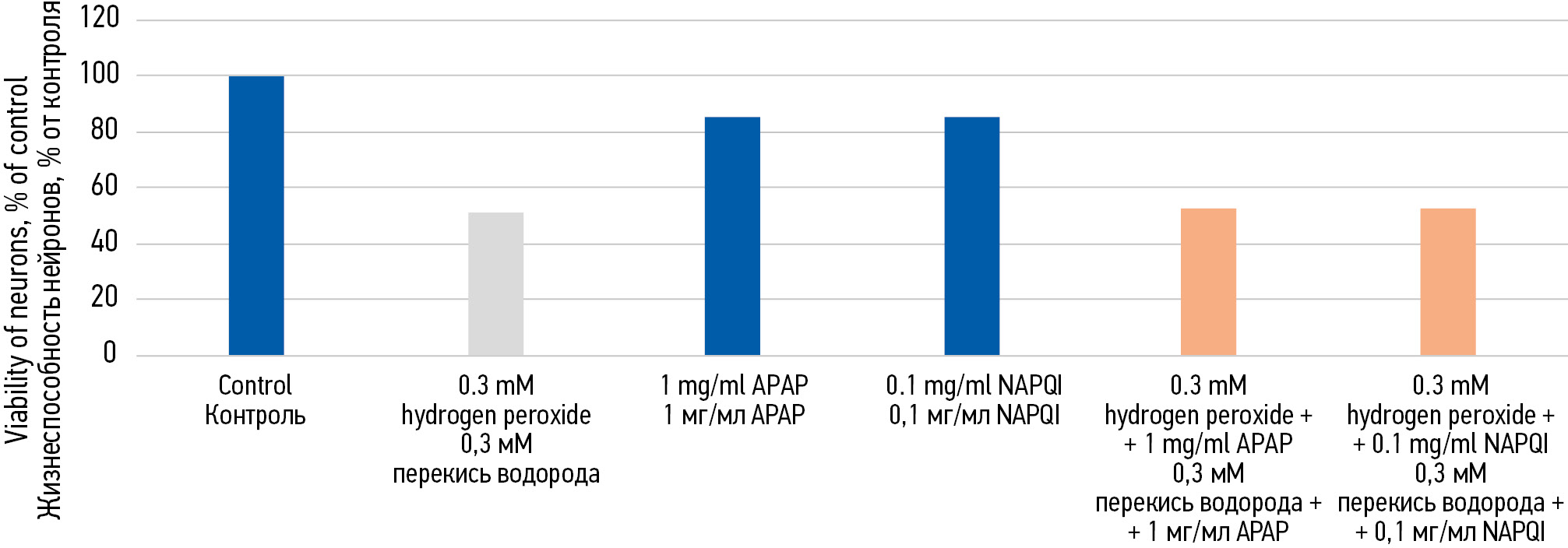 RESULTS: It has been shown that during preincubation of neurons in the cerebral cortex of the rats with paracetamol at a concentration of 1 mg/ml for 24 hours and subsequent incubation with 0.3 mM hydrogen peroxide, both hydrogen peroxide and paracetamol itself reduce the viability of neurons. Joint incubation with paracetamol and hydrogen peroxide also reduces the viability of neurons. The same effect of paracetamol and its metabolite is observed with the joint preincubation of paracetamol or NAPQI and hydrogen peroxide.