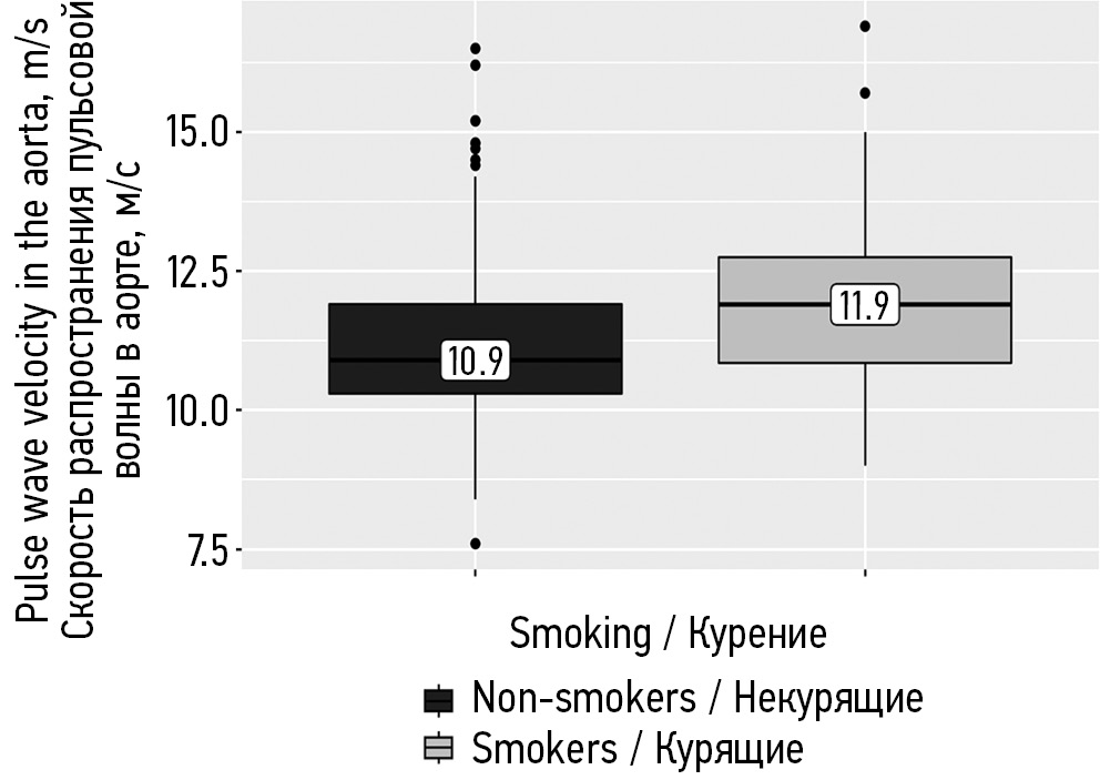 Fig. 1. Analysis of pulse wave velocity in aorta depending on the status of smoking / Рис. 1. Анализ скорости распространения пульсовой волны в аорте в зависимости от статуса курения