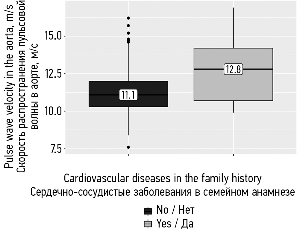 Fig. 2. Analysis of pulse wave velocity in the aorta depending on the presence of cardiovascular diseases in the family history / Рис. 2. Анализ скорости распространения пульсовой волны в аорте в зависимости от наличия сердечно-сосудистых заболеваний в семейном анамнезе
